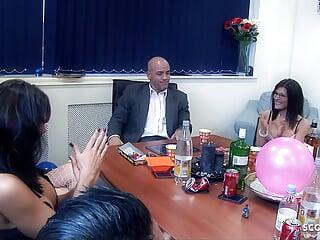 Vier Mädels mit großen Titten verführen einen Kollegen